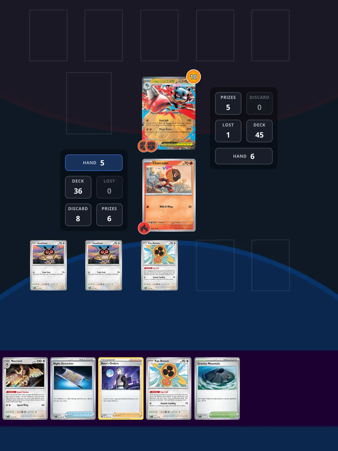 With the upcoming format rotation approaching, decks that depended on Reg G cards need to find ways to achieve their same goals. Let's take Ceruledge for example. It loses Squawkabilly ex, a card that helped acceelerate energy discards fast! In the upcoming regulation, more "Go first, strike fast" decks are appearing, such as Mega Lucario ex. In this case, your opponent, although having a bad hand, was able to play Mega Lucario quickly, before you had time to bring out Ceruledge. See if you can find the quick win with the help of your Noctowls! Both of these decks are built from Reg H-J.