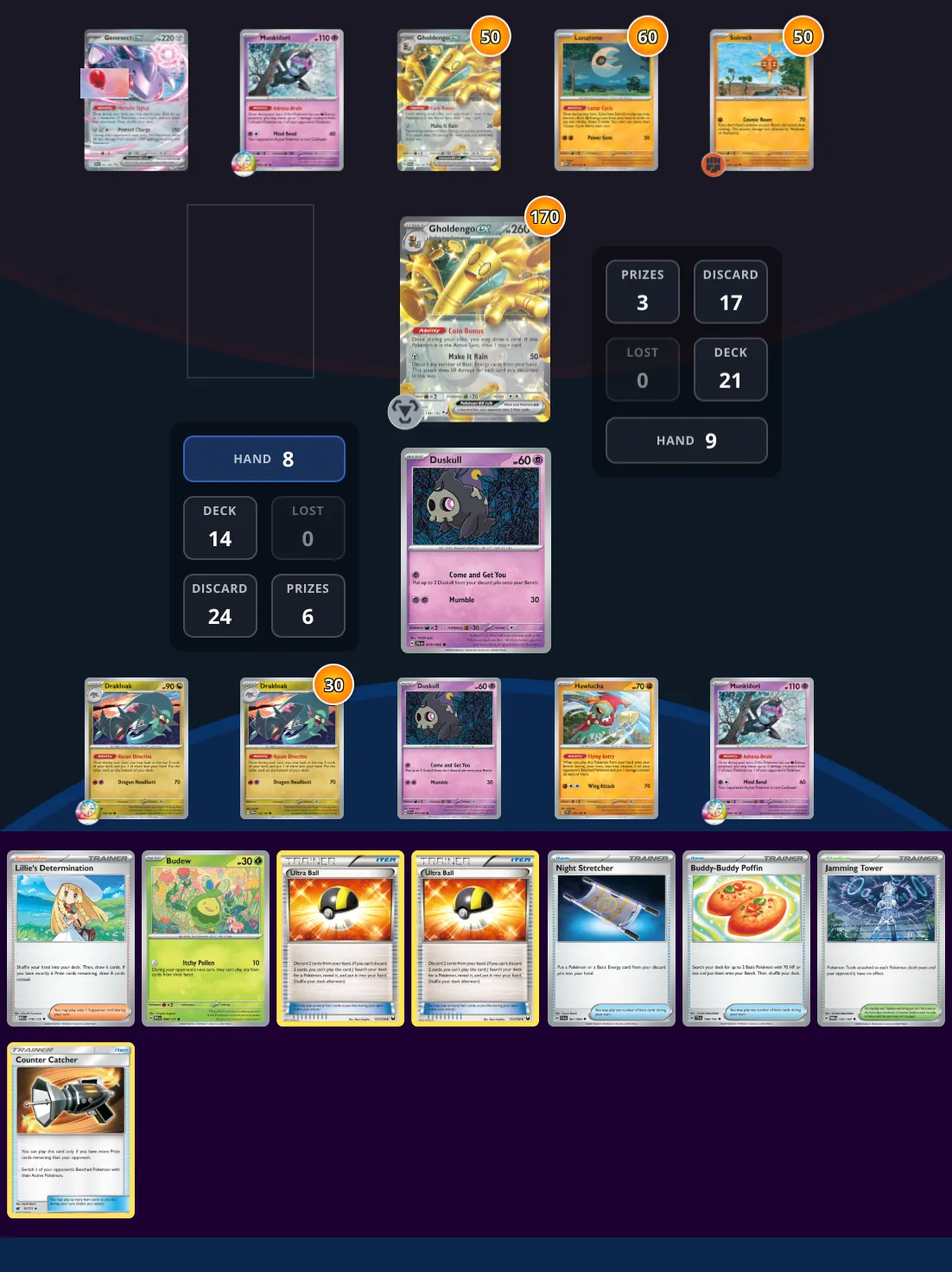 Dragapult has been slowly spreading their damage against Gholdengo, but has not been able to take a single KO. Gholdengo has been controlling the pace of this game with very little effort, but now, Dragapult has set up a board to their advantage, and can end the game this turn. Pilot Dragapult to victory and steal the game from Gholdengo's shiny hands.