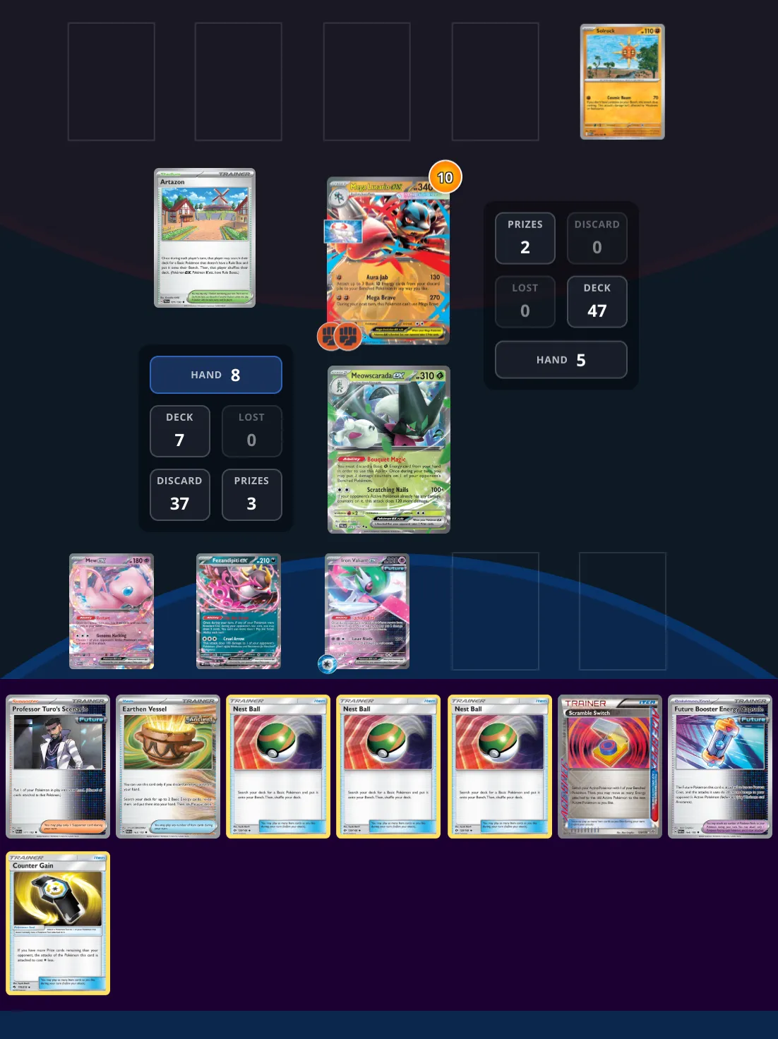 You've got 3 prizes to take versus an incredibly unfavorable matchup. Can you as Meowscarada's Trainer find a way to claw back a victory? A sequence heavy puzzle with a focus on finding outs against all odds!