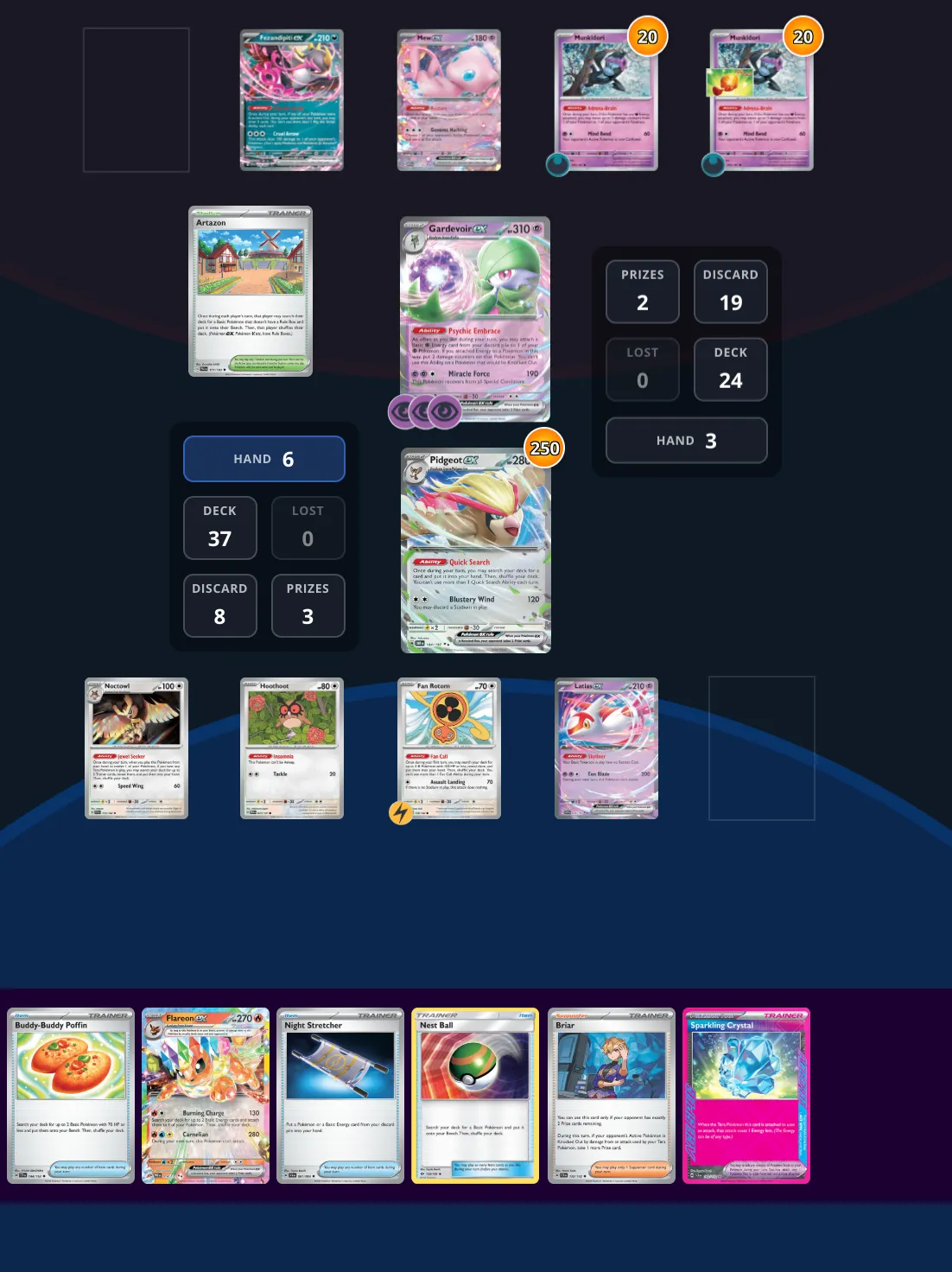 Gardevoir has game next turn and your board is looking very shaky, besides Pidgeot. Win this turn down 3 prizes to 2!