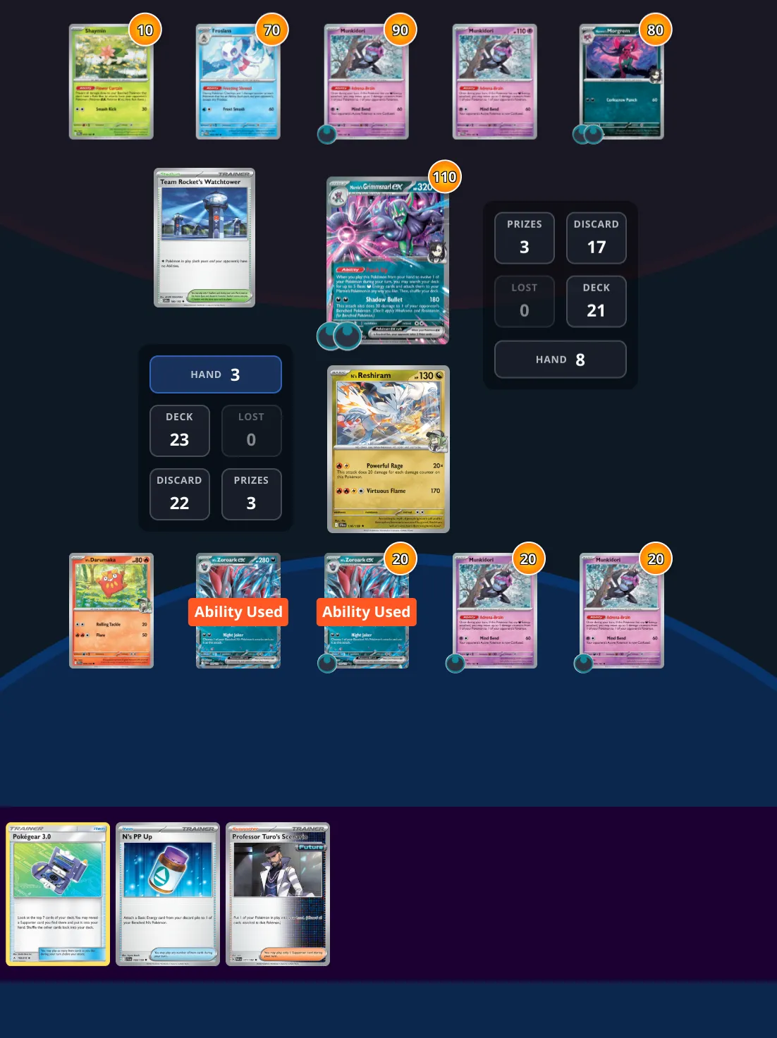 In this matchup with N's Zoroark ex vs Marnie's Grimmsnarl ex, your opponent has their full board set up to prevent you from causing damage, with Shaymin and 2 Munkidori's benched. With 1 Morgrem and Grimmsnarl also available, they will start biting away at your bench soon. This seems like an easy win, however, consider that you already used Zoroark's "Trade" ability (twice) and it didn't yield so well, or did it? I'm pretty sure there's a 3 prize move that will seal this game.