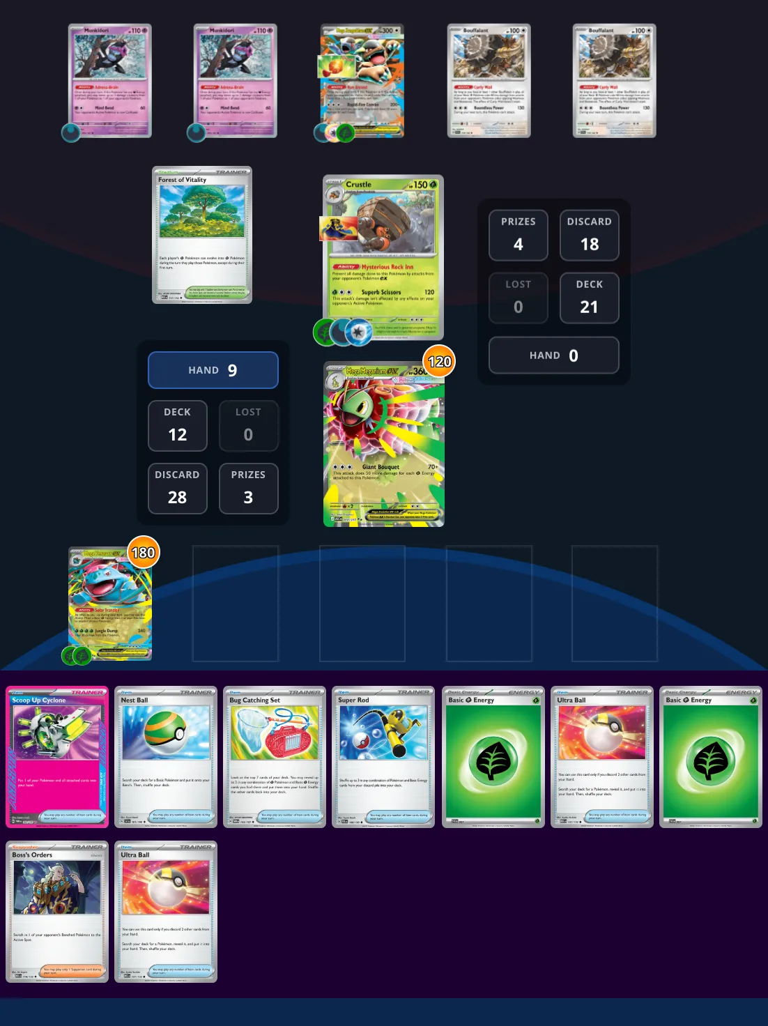 Note: "Flip the Script" is available. You've been stalled very well by a deck that runs not only Mega Kangaskhan / Bouffalant, but also a Crustle to shake things up. Unable to attack Crustle, and with your attacks on Kangaskhan being useless at the risk of getting Adrena-Brained back, you're debating every option possible—but then it clicks: you can take down the Kang this turn and grab those last three prizes. Don't try to luck into it, there's definitely a way to guarantee the win.