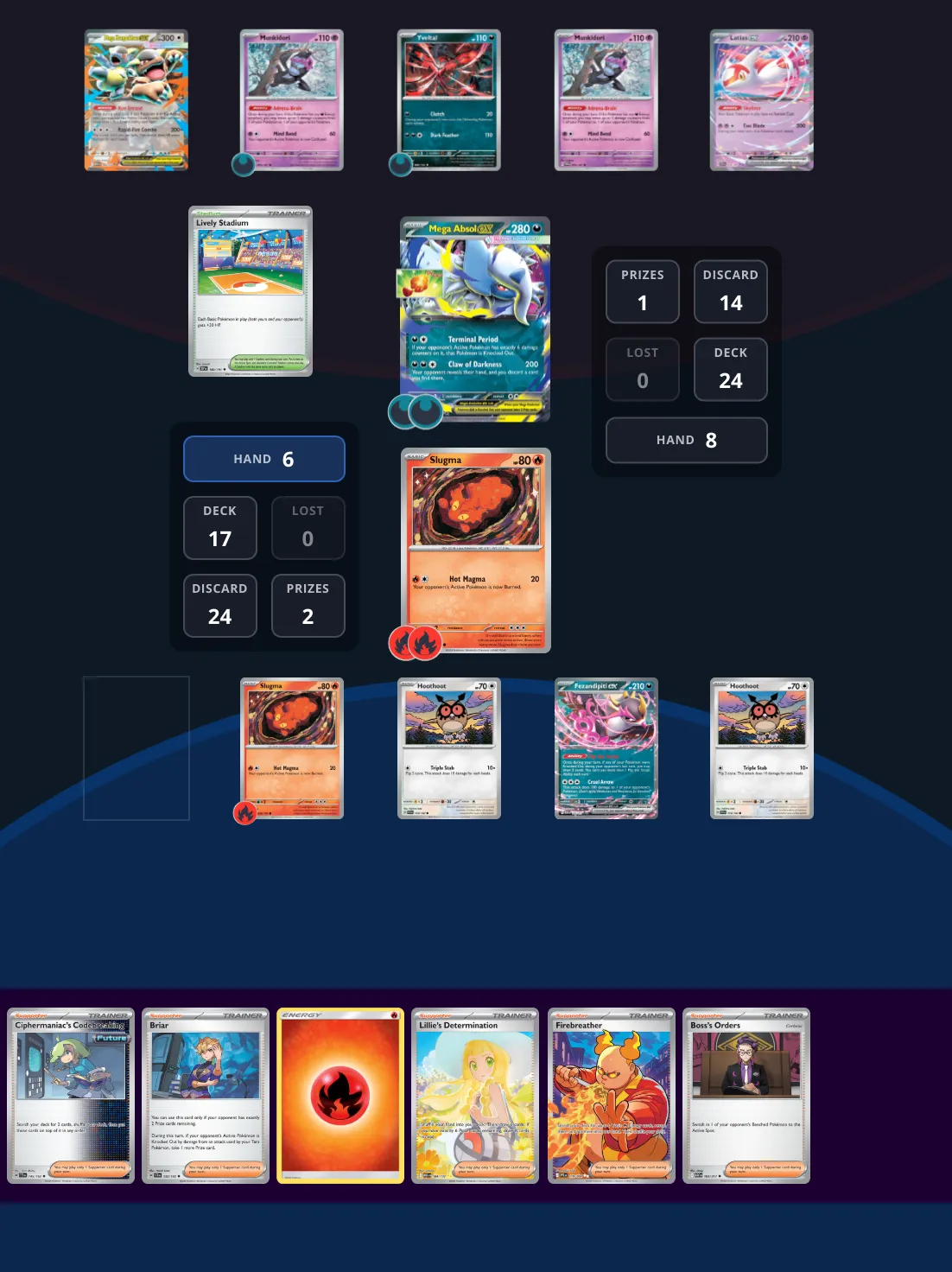 You're Magcargo ex, a very strange deck, playing against Mega Absol Box. Mega Absol ex has gotten rid of a lot of your resources and is on course to win the game. You don't have a lot of options, can you figure out a way to win?